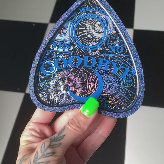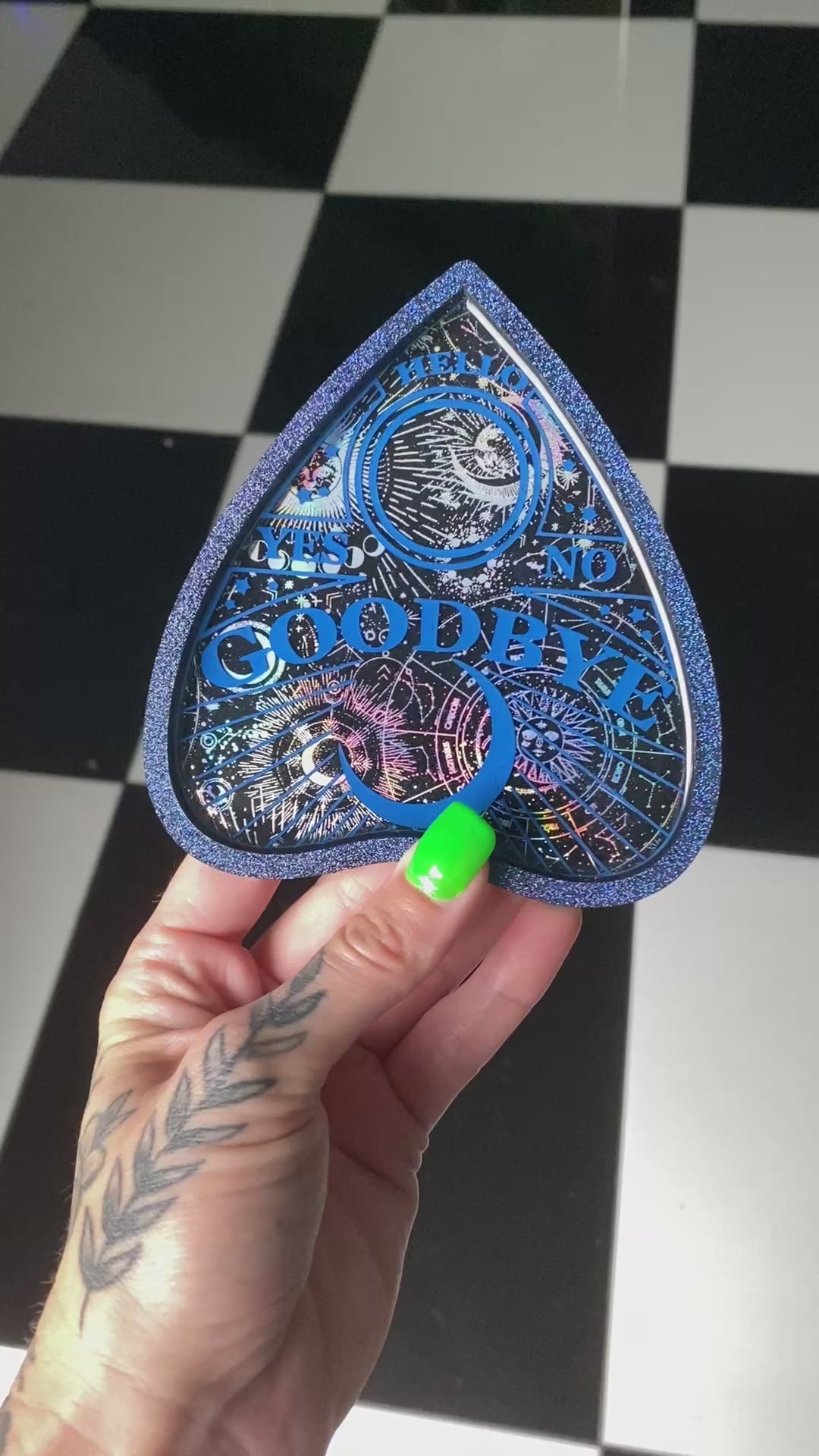 Listing is for 1 ouija inspired tray that is created with holographic blue pigment , holographic foil inserts. The tray is 5 inches tall with raised sides.