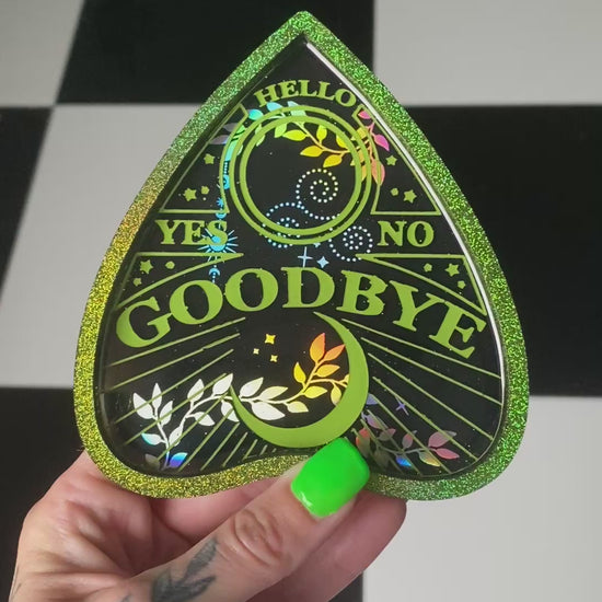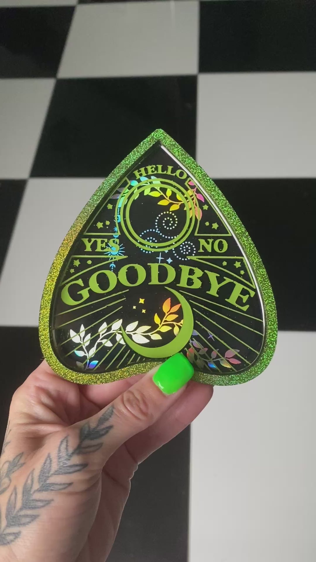 Listing is for 1 ouija inspired tray that is created with holographic green pigment , holographic foil inserts. The tray is 5 inches tall with raised sides.
